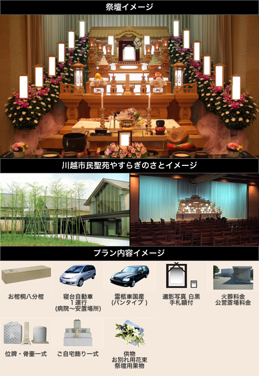 | プラン内容 | 【基本料金】 企画運営進行管理料(諸手配、諸手続き料含む) 安置、納棺、出棺、斎場立ち会い奉仕料 霊柩車(自宅~市民聖苑~斎場)2日間 司会進行料(通夜及び告別式)2日間 式場設営等人件費(2~3名含む) 棺代(市の用具の1号同等品、棺布団セット、杖) 副葬品等一式(仏衣、草履、霊膳、塔婆、忌日塔婆等) 位牌等一式(市の位牌同等品、線香及び蝋燭等含む) 受付用品一式(筆記用具、記帳用紙、香典受納箱等) 骨壷一式(市の用具の1号同等品) ※小人は、棺、骨壷の料金が変わります。 ※棺の特大サイズは割増料金になります。 【付帯料金】 写真代(白黒、四つ切、手札額リボン付) マイクロバス 会葬礼状(100枚、清め塩付) 寝台車代(病院~自宅、20km未満1回、病院下げ用シーツ代含む) 枕飾り料(守り刀、飾り台、お清め台一式) ドライアイス(1回分) 祭壇用盛り物(果物、仏菓子各一対) 後飾り、仏具一式 |